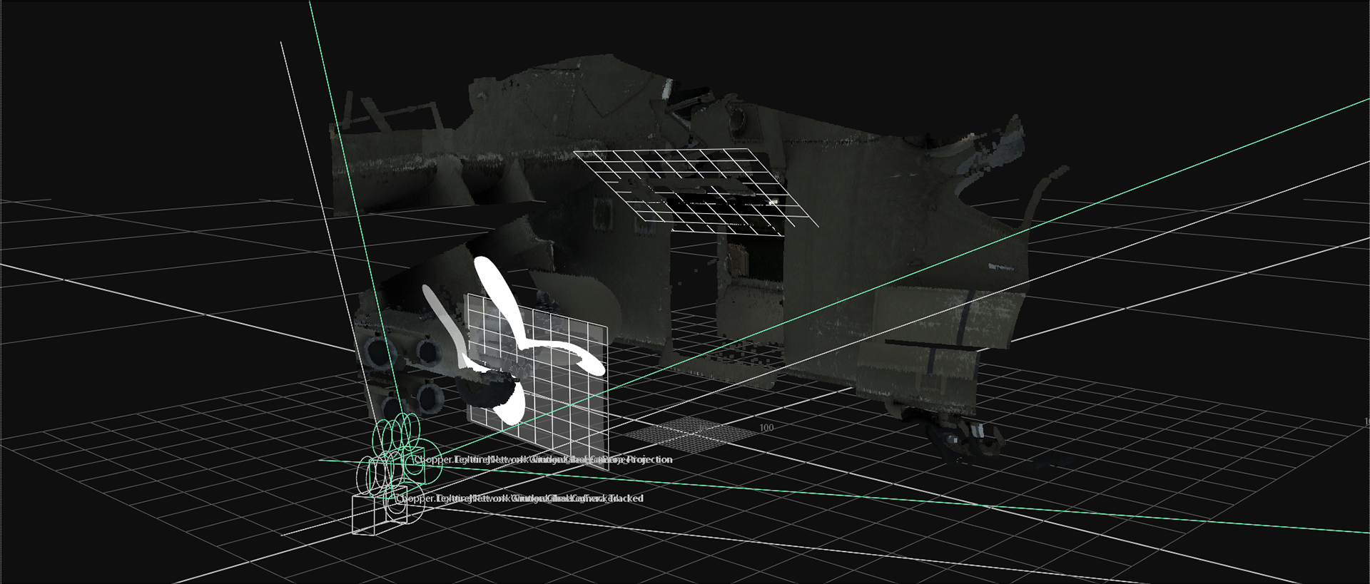 The chopper was then lit to match the daytime lighting of the live-action footage. Additional textures and decals were placed on the chopper in Nuke by projecting images onto 3D cards, and then moving those cards into the correct position using point cloud data.