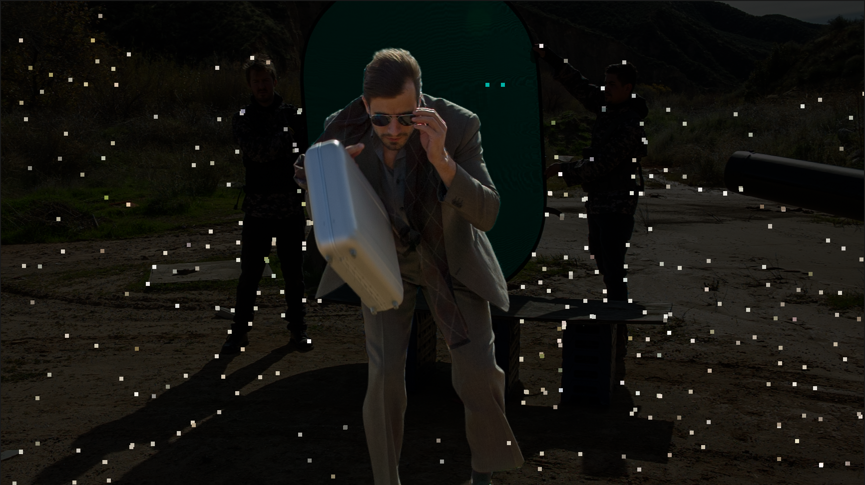 After keying the subject, 3D camera data was extracted from the footage. This allowed for 3D elements, such as the helicopter, to have real parallax as the camera moved through space.